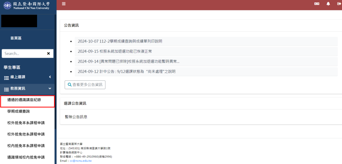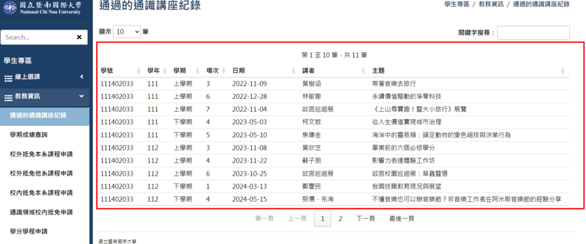 6.同學聽講紀錄將於講座結束一周內完成匯入,確認方式如下:登入新校務系統,點選「教務資訊」選擇「通過的通識講座紀錄」即可查詢到個人講座通過紀錄。(如有疑問請來信或來電確認)